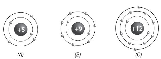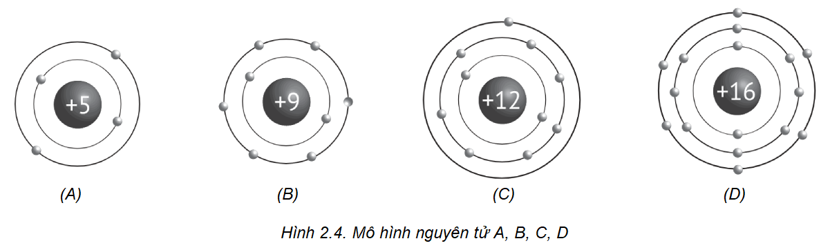 Điện tích hạt nhân của các nguyên tử A,B,C,D lần lượt là +5,+9,+12,+16. Bạn Lan vẽ các mô hình biểu diễn cấu tạo của các nguyên tử A,B,C,D như sau: a) Hãy tìm số proton của các nguyên tử A,B,C và D.