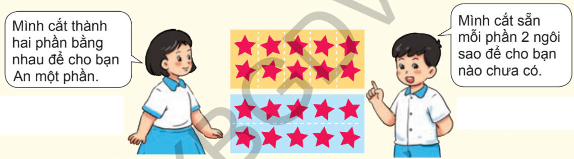 Chỉ ra mỗi bạn đã cắt tấm bìa màu nào. Viết phép tính theo mỗi cách cắt đó.