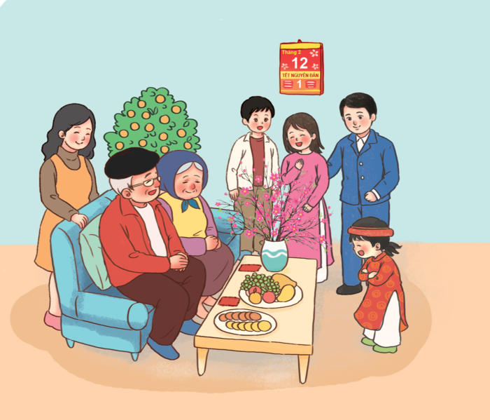 Chẳng bao lâu nữa sẽ là Tết Nguyên Đán. Chúng tôi đã dọn dẹp và đặt lên bàn thờ tổ tiên. Chúng tôi để xua đuổi mọi điều không may của năm cũ và đón năm mới. Sớm ngày mồng một Tết, tôi mặc chiếc áo dài mới để mong cho những điều mới mẻ và tốt đẹp sẽ đến. Tôi được bố mẹ mừng tuổi, những có màu đỏ - màu của sự may mắn. Cả gia đình tôi bắt đầu đi lễ, đi chúc Tết họ hàng và may mắn sẽ đến với tất cả mọi người trong năm mới.