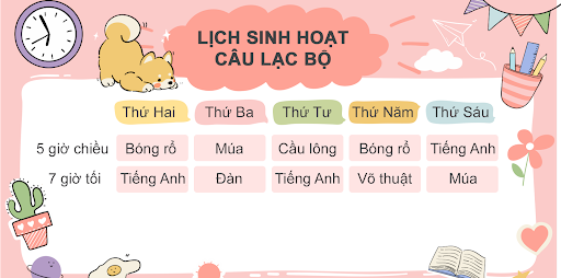 Đọc lịch sinh hoạt câu lạc bộ và chọn tất cả câu trả lời đúng.